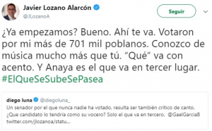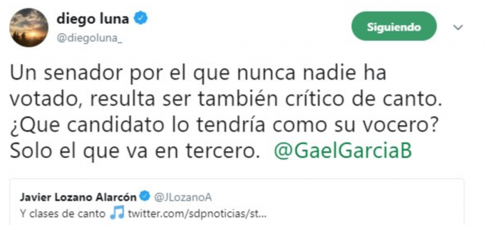 Después de que el miércoles Lozano se burló de que Gael necesitaba “clases de canto, Diego Luna le respondió este viernes en su cuenta de Twitter: “Un senador por el que nunca nadie ha votado, resulta ser también crítico de canto. ¿Que candidato lo tendría como su vocero? Solo el que va en tercero”.