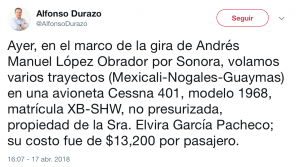 El viaje en avioneta que hizo este lunes Andrés Manuel López Obrador, candidato presidencial de la coalición ‘Juntos Haremos Historia’, y su equipo de trabajo de Mexicali a Nogales costó unos 66 mil pesos, según uno de sus colaboradores.