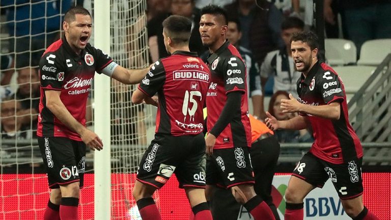 Futbolistas de Tijuana festejan un gol en el Estadio BBVA
