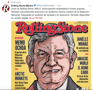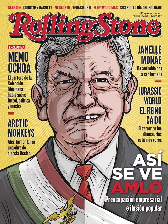 La fama de Andrés Manuel López Obrador trascendió de actos proselitistas, de foros empresariales a un nivel de leyenda musical. Como si se tratara del regreso de un grupo a los escenarios musicales, AMLO es el rockstar de la portada de junio de la revista Rolling Stone.