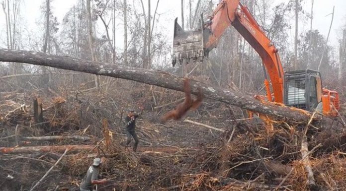 Esta desgarradora escena fue captada en video en Kalimantan Occidental, Indonesia, recientemente cuando un equipo de construcción demolió una sección del bosque Sungai Putri, conocido hábitat de orangutanes de Borneo en peligro crítico.