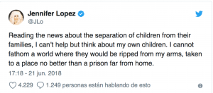 La también actriz y bailarina trató de imaginar cómo se sentiría si sus propios hijos fueran “arrancados de mis brazos”, uniéndose al creciente coro de artistas, activistas y políticos que denuncian la política de separación de familias migrantes de la Casa Blanca. Jennifer animó en sus tuits a todos los estadunidenses a unirse para luchar contra lo que ella llamó: “atrocidades”.