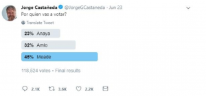 El coordinador de campaña del candidato presidencial de Por México al Frente, Jorge Castañeda, sondeó a usuarios en Twitter sobre quién ganará las elecciones. Y el perdedor resultó ser Ricardo Anaya.