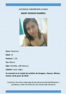 La joven fue reportada como desaparecida el pasado 26 de junio, en la ciudad de Juchitán de Zaragoza; su cuerpo presentaba heridas en el cuello y tóraxproducidas por arma punzocortante.