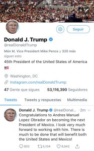 A través de Twitter, el mandatario norteamericano aseguró que tiene muchas ganas de trabajar con el tabasqueño.