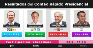 Al computarse apenas 01.1253 por ciento de las casillas, es decir mil 765 de las 156 mil 840 de las instaladas, el aspirante de los partidos Morena, del Trabajo y Encuentro Social suma 249 mil 520 sufragios.