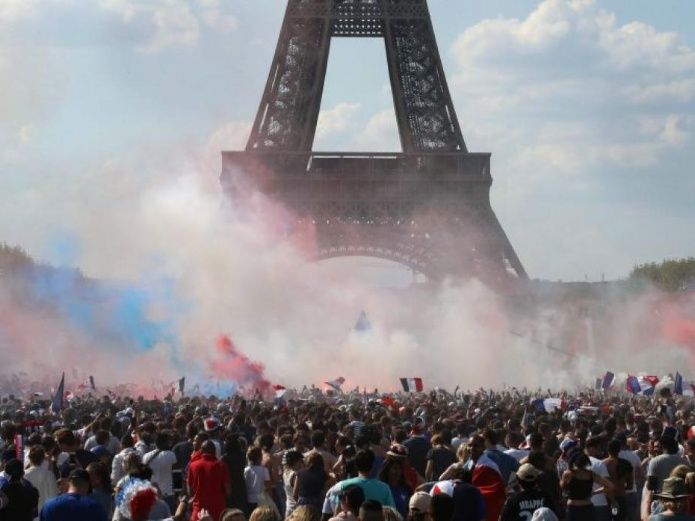 Numerosos seguidores del equipo nacional encendieron bengalas que despidieron humo rojo frente al lugar más emblemático de París, Francia, La Torre Eiffel, donde una multitud atestiguó mediante una pantalla gigante el triunfo por 4-2 sobre Croacia.