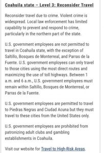Debido a la violencia criminal, advierte a sus ciudadanos a no viajar a Colima, Guerrero, Michoacán, Sinaloa y Tamaulipas; y en el caso de Coahuila, sólo Saltillo, Bosques de Monterreal y Parras de la Fuente, en tanto que a Piedras Negras y Acuña prohíbe trasladarse entre ciudades, y solo se les permite viajar cruzando desde los Estados Unidos.