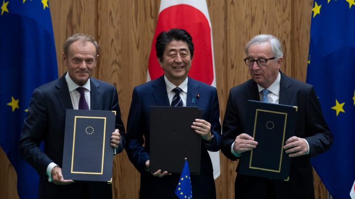 “Enviamos una señal clara de que estamos haciendo frente al proteccionismo”, dijo el presidente del Consejo Europeo, Donald Tusk, quien representa a 28 líderes nacionales. “La UE y Japón se mantienen abiertos a la cooperación”.