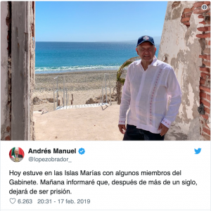“Hoy estuve en las Islas Marías con algunos miembros del Gabinete. Mañana informaré que, después de mas de un siglo, dejará de ser prisión”, declaró el mandatario en su red social.