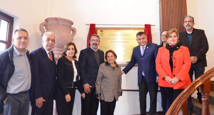 Posteriormente, las y los presentes se trasladaron al vestíbulo del Congreso del Estado, donde el señor Alejandro Cerecero, hijo del homenajeado, brindó una explicación del trabajo realizado para la creación del mural en honor a Miguel Ramos Arizpe que se encuentra en el vestíbulo del Congreso. Asimismo, por parte del diputado Eduardo Olmos, las diputadas Luz Natalia Virgil Orona, presidenta de la Mesa Directiva y María Eugenia Calderón Amezcua, coordinadora de la comisión de educación del Congreso, así como los familiares del maestro Eloy Cerecero, se llevó a cabo la develación de una placa alusiva a este homenaje, la cual se encuentra colocada en una de las paredes del recinto.