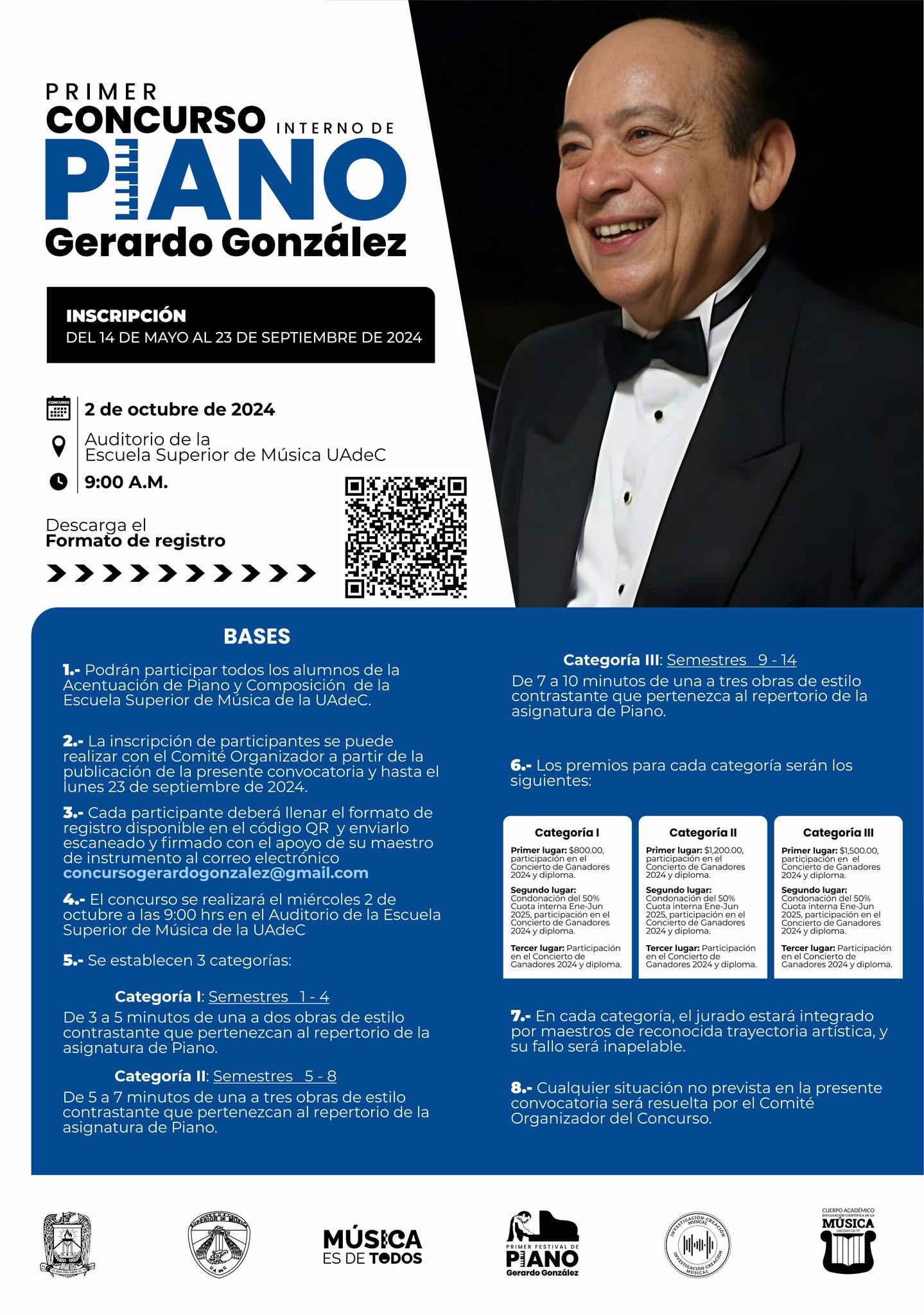 Cada participante deberá llenar el formato de registro disponible en el código QR publicado en la página de FacebookEscuela Superior De Música UAdeC y enviarlo escaneado y firmado con el apoyo de su maestro de instrumento al correo electrónico concursogerardogonzalez@gmail.com.