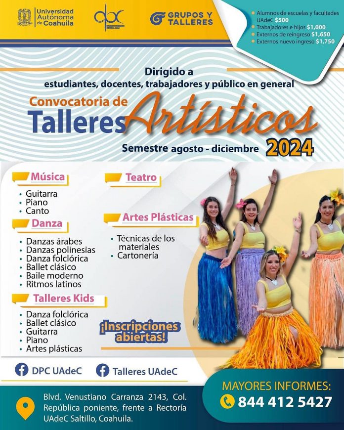SALTILLO, Coahuila. 6 de agosto de 2024. La Universidad Autónoma de Coahuila a través de la Coordinación General de Difusión y Patrimonio Cultural y el Departamento de Formación Artística, invita a la comunidad universitaria y público en general a inscribirse a los Talleres Artísticos durante el mes de agosto.