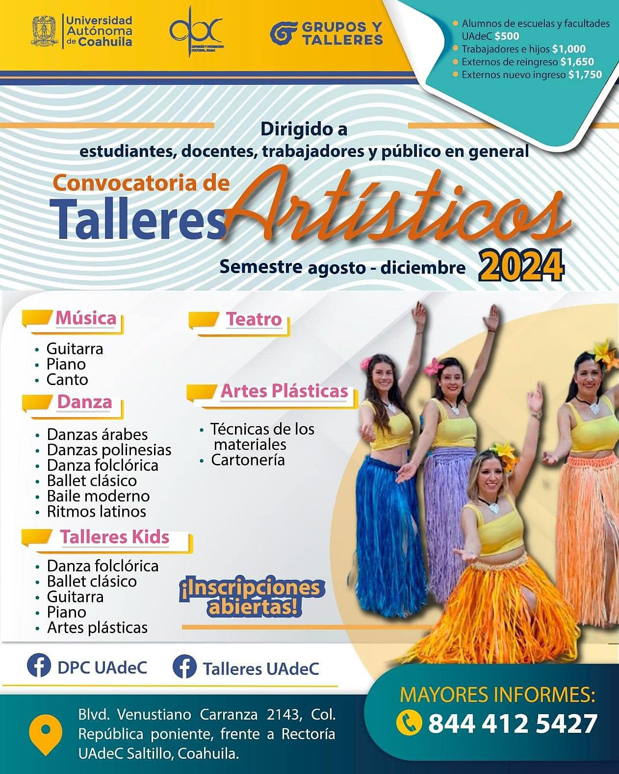 Para más información, comunicarse al Departamento de Formación Artística de Grupos y Talleres de la UAdeC al teléfono (844) 412 54 27 o en la página de Facebook “Talleres UAdeC”.