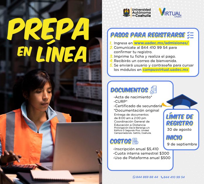SALTILLO, Coahuila. 20 de agosto de 2024. La Universidad Autónoma de Coahuila a través de la Coordinación General de Educación a Distancia, ofrece el Bachillerato en Línea, por lo que convoca a las personas interesadas a realizar su registro en la página www.admisiones.uadec.mx, la fecha límite es el 30 de agosto de 2024.