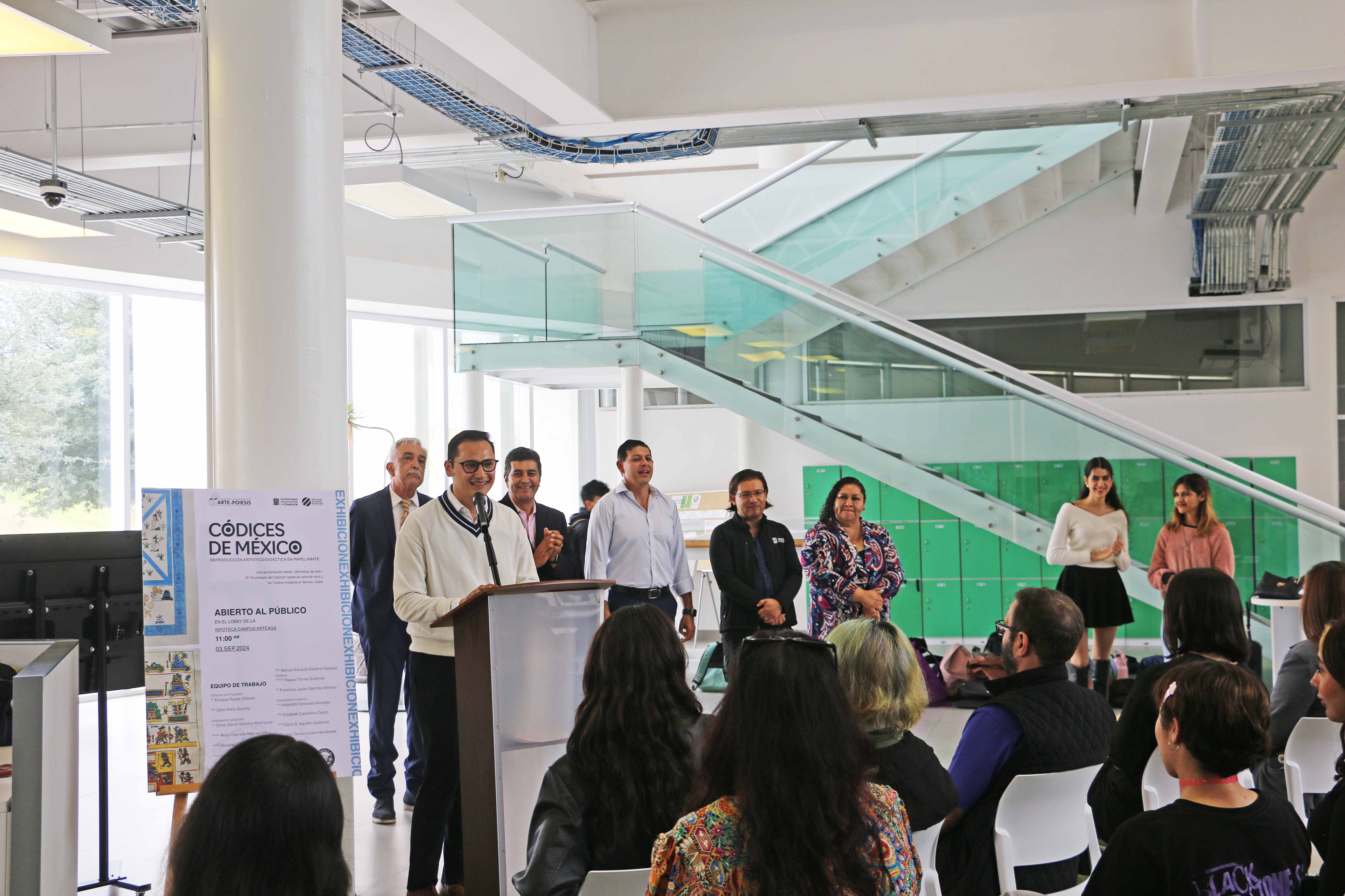 Durante su intervención, los docentes Enrique Reyes y Alejandro Cerecero, destacaron la importancia del proyecto y explicaron que la exposición se organiza en tres secciones: la primera presenta réplicas de códices, como el Códice Boturini y el Códice Borbónico, que ilustran rituales, mapas y calendarios de la época prehispánica.