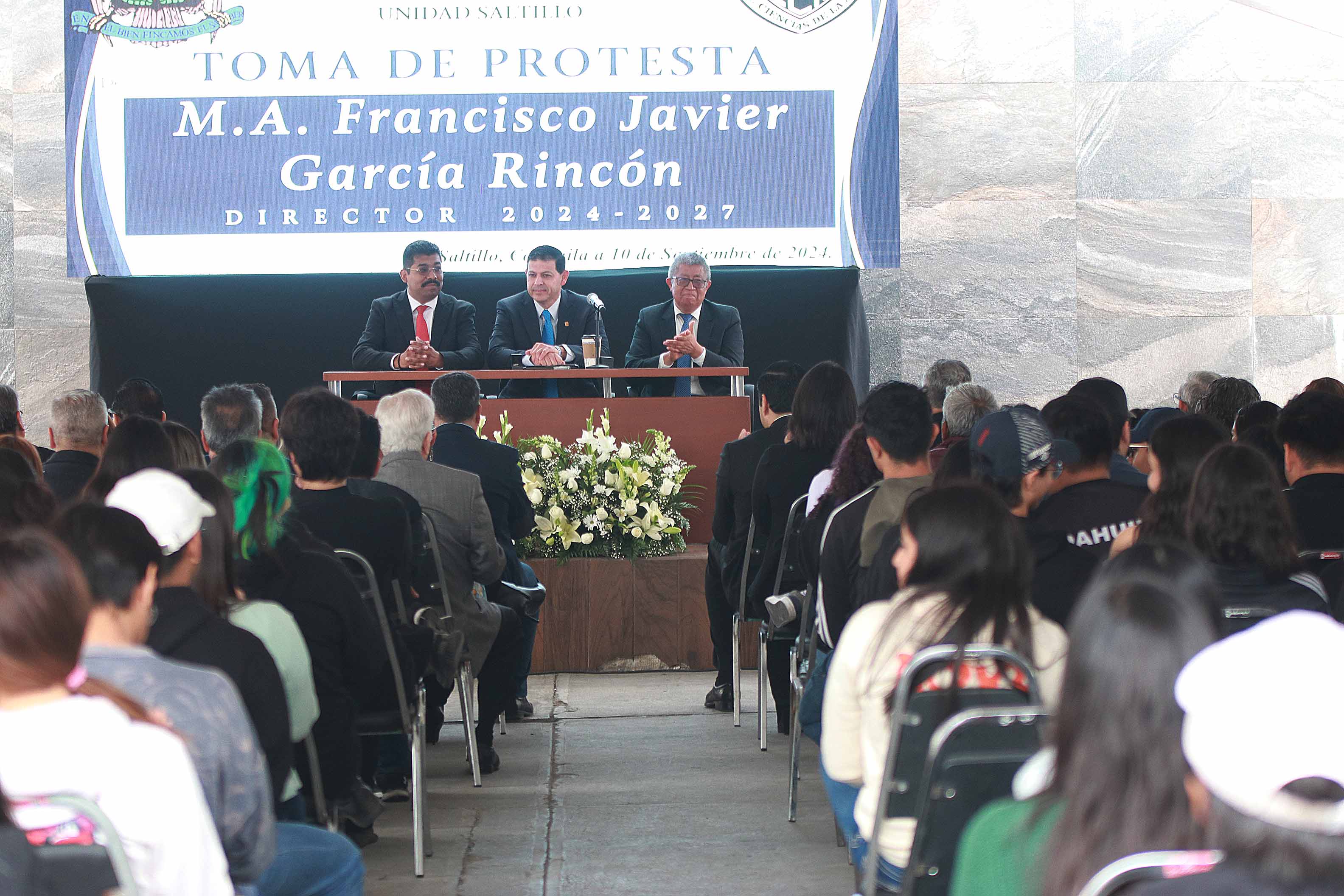 En el patio central del plantel, asistió en representación de la coordinadora de Unidad Saltillo, Eva Kerena Hernández Martínez, el secretario general, Víctor Cobos Martínez, funcionariado universitario, directores de las diversas Escuelas, Facultades e Institutos, integrantes del Consejo Directivo del plantel, comunidad docente y estudiantil.