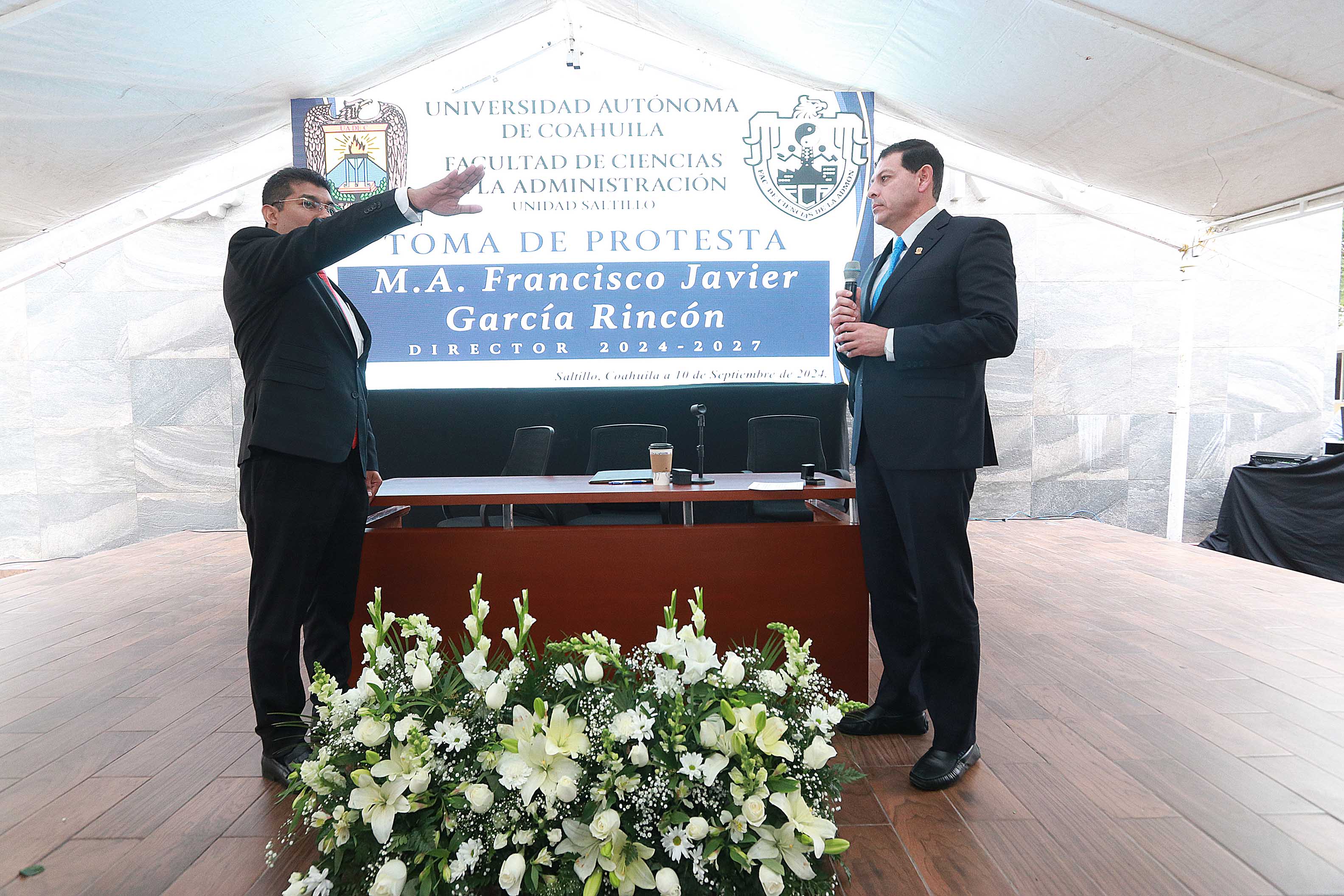 SALTILLO, Coahuila. 10 de septiembre de 2024. El rector de la Universidad Autónoma de Coahuila, Octavio Pimentel Martínez, tomó protesta al M.C. Francisco Javier García Rincón, como director de la Facultad de Ciencias de la Administración FCA Unidad Saltillo, para el periodo 2024-2027.