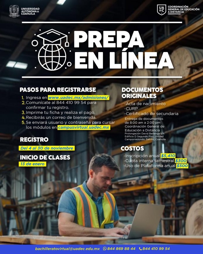SALTILLO, Coahuila. 6 de noviembre de 2024. La Universidad Autónoma de Coahuila a través de la Coordinación General de Educación a Distancia, ofrece el Bachillerato en Línea, por lo que convoca a las personas interesadas a realizar su registro en la página www.admisiones.uadec.mx durante el mes de noviembre de 2024.