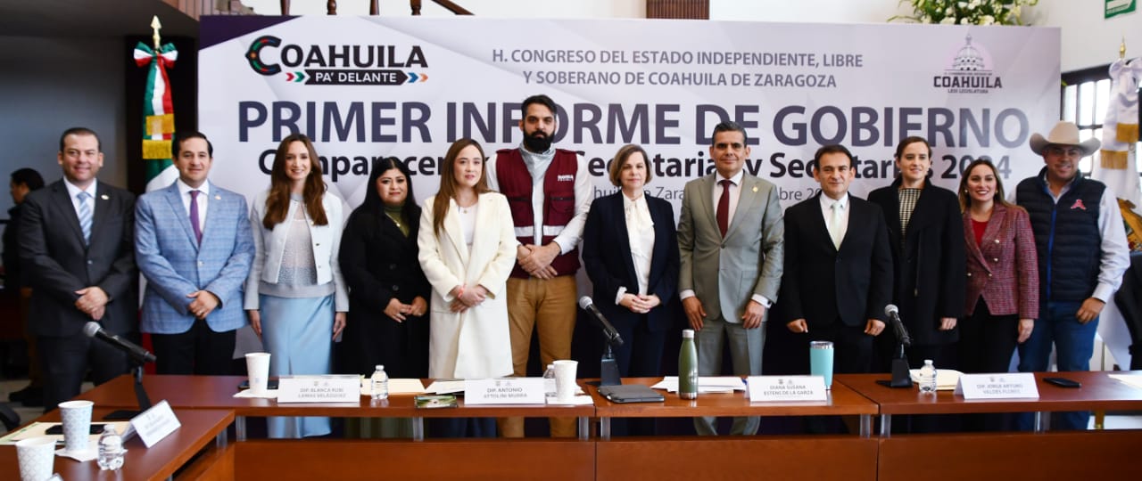 Saltillo, Coahuila a 4 de diciembre de 2024.-El Congreso del Estado continúa con el ciclo de comparecencias de funcionarias y funcionarios del gabinete estatal, recibiendo este miércoles a la secretaria de Medio Ambiente, Diana Susana Estens de la Garza; al secretario de Economía; Luis Eduardo Olivares Martínez; a la secretaria de Turismo y Desarrollo de Pueblos Mágicos, Cristina Amezcua González; así como a la secretaria de Fiscalización y Rendición de Cuentas, Elma Marisol Martínez González, para el análisis del Primer Informe de Gobierno del Ingeniero Manolo Jiménez Salinas.