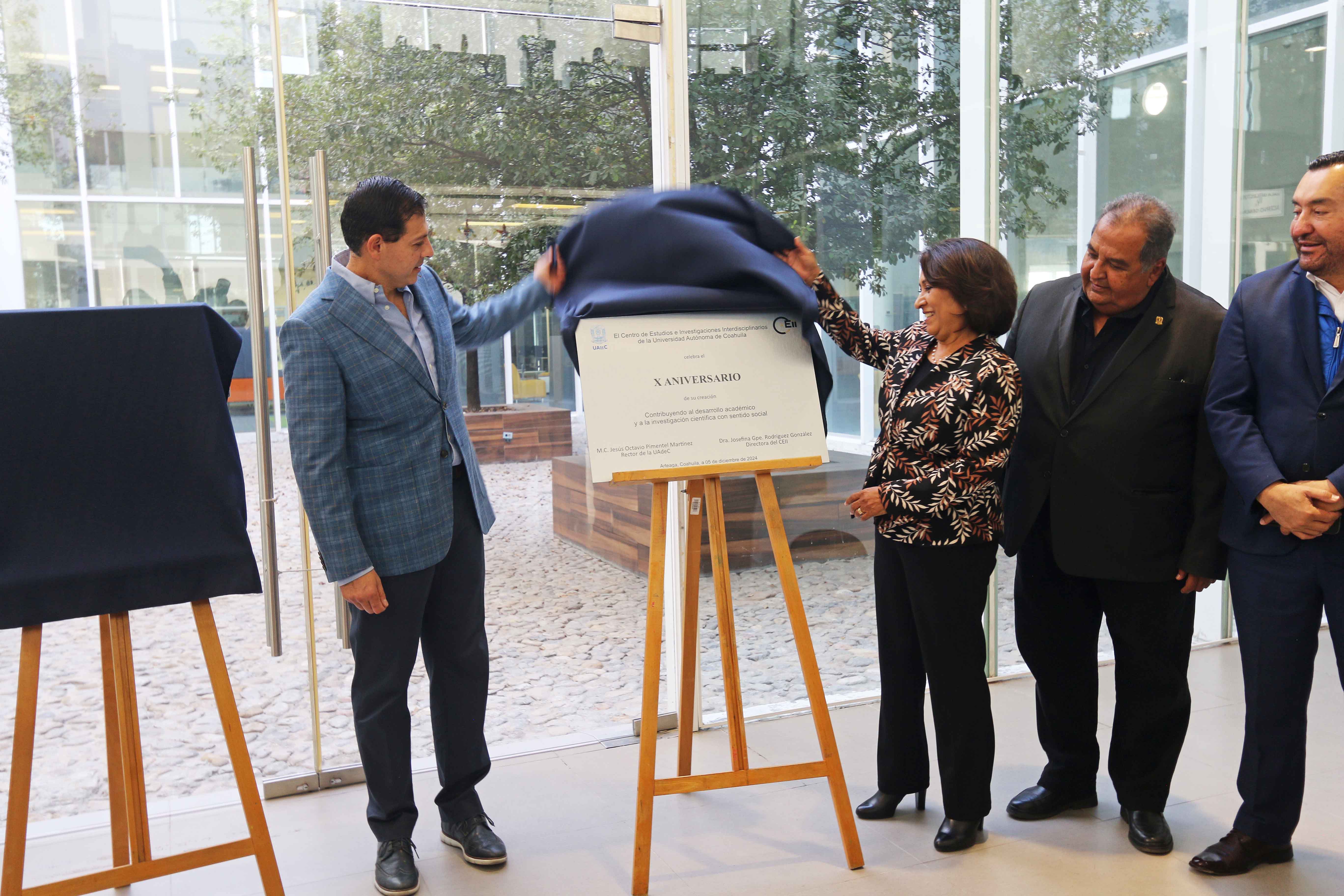 La celebración concluyó en la planta baja de la Infoteca Arteaga, donde el rector de la UAdeC, Octavio Pimentel Martínez junto con la directora del CEII, Josefina Rodríguez González, realizaron la Develación de la Placa Conmemorativa del Décimo Aniversario del CEII y la Inauguración de la Galería de Directores con la colocación de la fotografía oficial del Dr. Santiago Chío Zulaica, primer director del CEII.