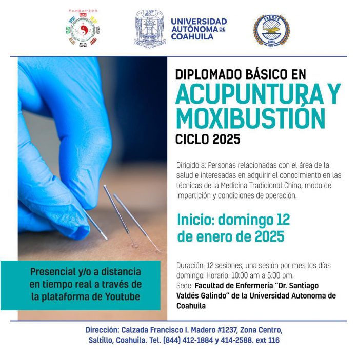 SALTILLO, Coahuila. 5 de diciembre de 2024. La Universidad Autónoma de Coahuila a través de la Facultad de Enfermería “Dr. Santiago Valdés Galindo” Unidad Sureste, en conjunto con el Instituto Alcocer Medicina Tradicional China y Acupuntura A.C, invitan al Diplomado Básico en Acupuntura y Moxibustión Ciclo 2025, que iniciará el 12 de enero.