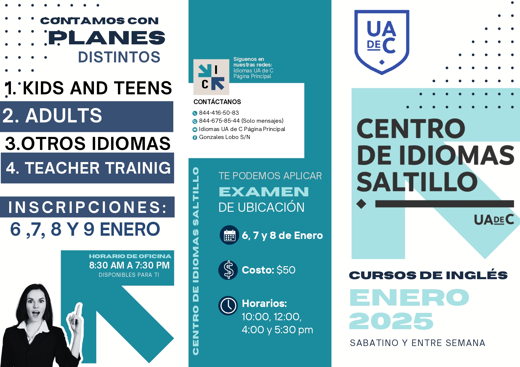 Para más información, ingresar a los sitios https://view.genially.com/66d0d1669a3c8ac5bbd35882/interactive-content-curso-entre-semana y https://view.genially.com/66c366958aafe76f8784b777/interactive-content-curso-sabatino, llamar al teléfono (844) 416 50 83, escribir al (844) 675 85 44 o acudir al Centro de Idiomas que se ubica en calle Hidalgo esquina con Salvador González Lobo en la colonia República Oriente.