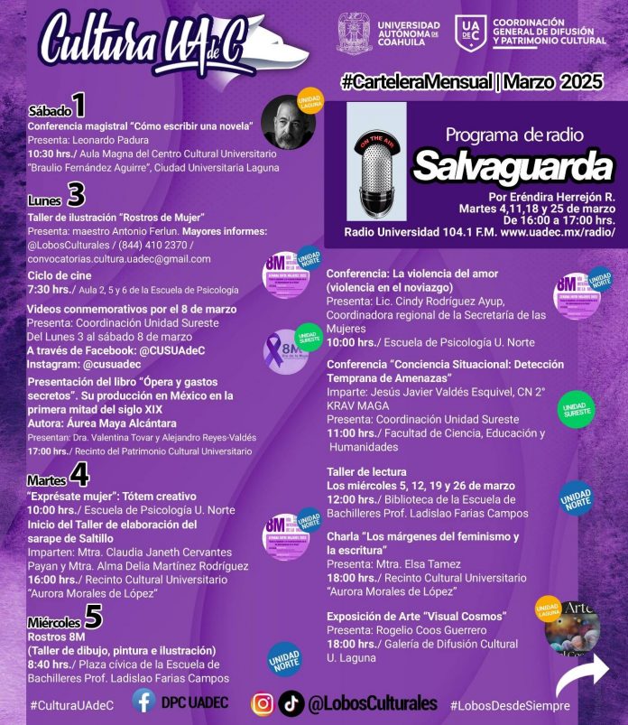 SALTILLO, Coahuila. 4 de marzo de 2025. La Universidad Autónoma de Coahuila a través de la Coordinación General de Difusión y Patrimonio Cultural (DPC), invita a la comunidad universitaria de las Unidades Sureste, Norte y Laguna, y al público en general a disfrutar de las múltiples actividades culturales programadas durante marzo.