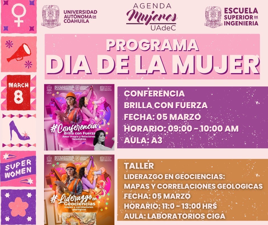 En la Escuela Superior de Ingeniería de Nueva Rosita Coahuila, el 5 de marzo impartirán las conferencias “Brilla con fuerza” de 9:00 a 10:00 horas y el Taller “Liderazgo en Geociencias: mapas y correlaciones geológicas” de 11:00 a 13:00 horas en los Laboratorio del Centro de Investigación en Geociencias Aplicadas” y de las 17:00 a las 19:00 horas el Taller Práctico Interactivo Mecánica Automotriz Básica para Mujeres en el Aula A3 del plantel.