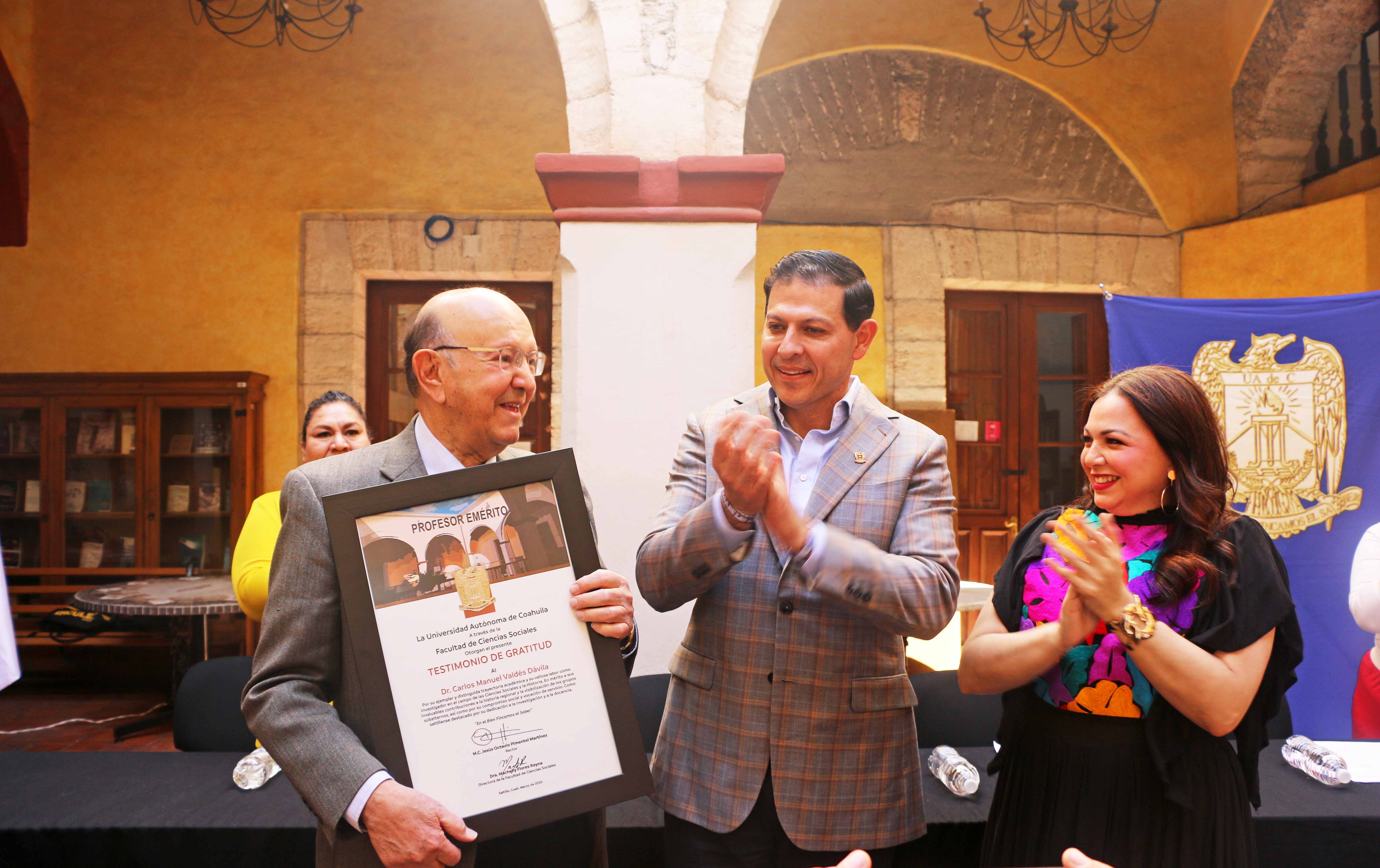SALTILLO, Coahuila. 18 de marzo de 2025. La Universidad Autónoma de Coahuila, a través de la Facultad de Ciencias Sociales (FCS) y su Consejo Directivo, otorgó el reconocimiento como Profesor Emérito al Dr. Carlos Manuel Valdés Dávila, por su trayectoria académica y contribución al desarrollo de las ciencias sociales en la región.