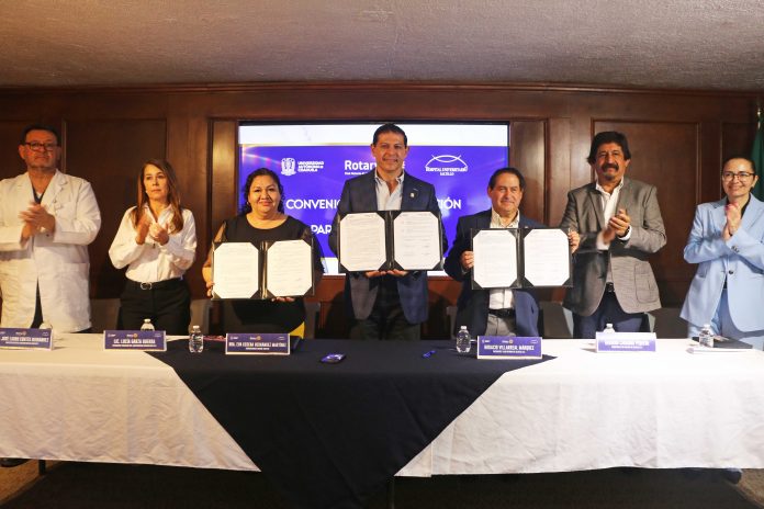 El documento fue signado en el Aula Magna “Carlos Avilés Falco” del Hospital Universitario por el rector de la UAdeC, Octavio Pimentel Martínez y el presidente del Club Rotario de Saltillo, Horacio Villarreal Márquez, acompañados por la coordinadora de Unidad Sureste, Eva Kerena Hernández, la coordinadora de Vinculación e Innovación Productiva, Karla Patricia Valdés García