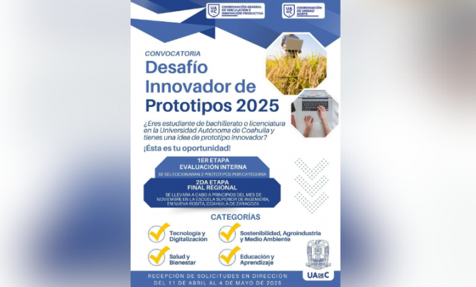 La Universidad Autónoma de Coahuila (UAdeC) a través de la Coordinación General de Vinculación e Innovación Productiva, la Coordinación de Unidad Norte y la Academia de Directores de dicha unidad, invita a su comunidad estudiantil de bachillerato y licenciatura de la Región Centro-Norte a participar en el Desafío Innovador de Prototipos 2025.