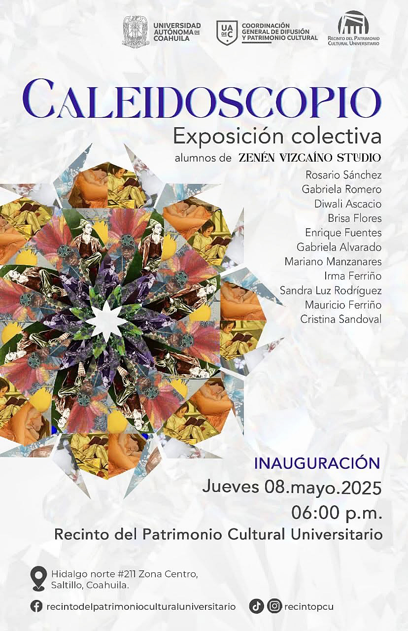 SALTILLO, Coahuila. 15 de mayo de 2025. La Universidad Autónoma de Coahuila, a través de la Coordinación de Difusión y Patrimonio Cultural, invita a la comunidad universitaria y al público en general a visitar la exposición pictórica “Caleidoscopio”, instalada en el Recinto del Patrimonio Cultural Universitario, ubicado en la calle Hidalgo 211, en el Centro Histórico de Saltillo.