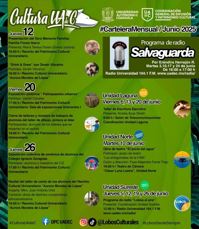 SALTILLO, Coahuila. 3 de junio de 2025.La Universidad Autónoma de Coahuila a través de la Coordinación General de Difusión y Patrimonio Cultural (DPC), invita a la comunidad universitaria de las Unidades Sureste, Norte y Laguna, y al público en general a disfrutar de las actividades culturales programadas durante el mes de junio 2025.