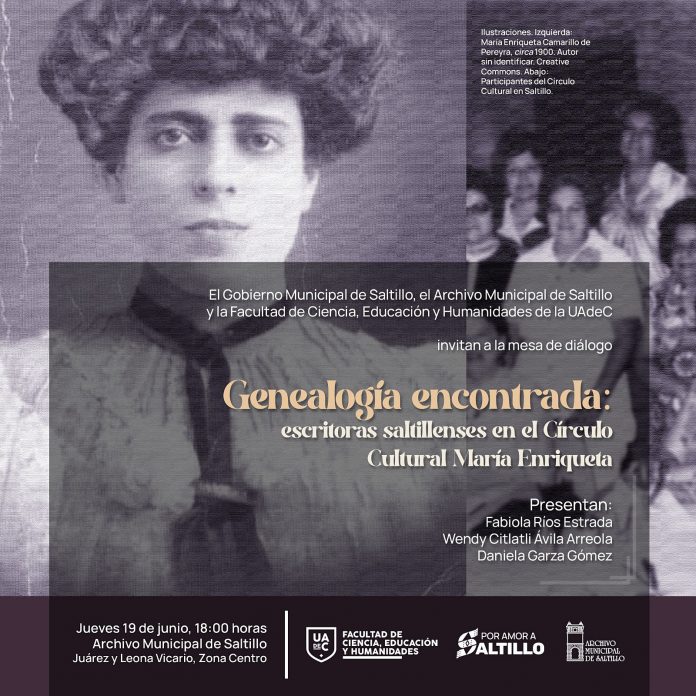 SALTILLO, Coahuila. 17 de junio de 2025. Como parte del esfuerzo por rescatar la memoria literaria de mujeres del noreste mexicano, la Facultad de Ciencia, Educación y Humanidades (FCEyH) de la Universidad Autónoma de Coahuila, en colaboración con el Gobierno Municipal y el Archivo Municipal de Saltillo, invitan a la Mesa de Diálogo “Genealogía encontrada: escritoras saltillenses en el Círculo Cultural María Enriqueta”.