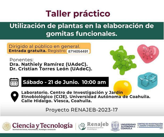 VIESCA, Coahuila. 20 de junio de 2025. La Universidad Autónoma de Coahuila, a través del Centro de Investigación y Jardín Etnobiológico del Semidesierto (CIJE), llevará a cabo el Taller práctico “Utilización de plantas en la elaboración de gomitas funcionales”, este sábado 21 de junio a las 10:00 horas en el Laboratorio del CIJE, ubicado en calle Hidalgo S/N, Colonia El Tinaco en Viesca, Coahuila.