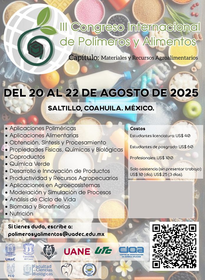 SALTILLO, Coahuila. 7 de agosto de 2025. La Universidad Autónoma de Coahuila, a través de las Facultades de Ciencias Químicas, Enfermería y Odontología Unidad Sureste y Ciencias Biológicas Unidad Laguna y en colaboración con la Universidad del Cauca de Colombia, llevará a cabo el Tercer Congreso Internacional de Polímeros y Alimentos, que se desarrollará del 20 al 22 de agosto de 2025 en el Centro Cultural Vito Alessio Robles ubicado en calle Miguel Hidalgo y Costilla en el Centro Histórico de Saltillo.