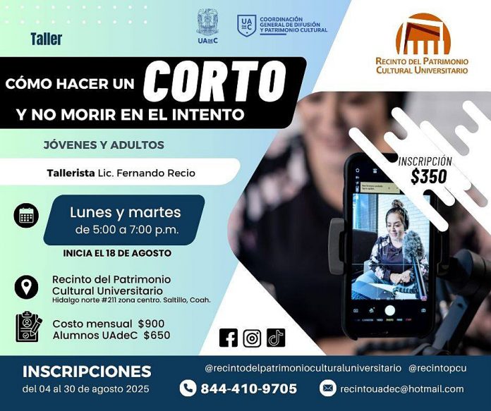 El 18 de agosto inicia el Taller de Producción Cinematográfica “¿Cómo hacer un Corto y no morir en el intento?”, para jóvenes y adultos los lunes y martes de 17:00 a 19:00 horas, impartido por el Lic. Fernando Recio; el costo mensual es de $900 pesos para público en general y $650 para alumnos UAdeC.