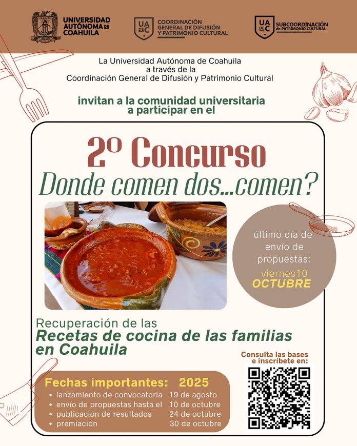 SALTILLO, Coahuila. 19 de agosto de 2025. La Universidad Autónoma de Coahuila a través de la Coordinación de Difusión y Patrimonio Cultural (DPC), invita a la comunidad universitaria de las Unidades Sureste, Laguna y Norte a participar en el “Segundo Concurso Universitario de Rescate de Patrimonio Inmaterial: Donde comen dos, comen…”, cuyo objetivo principal es la recuperación de recetas tradicionales de las familias coahuilenses.