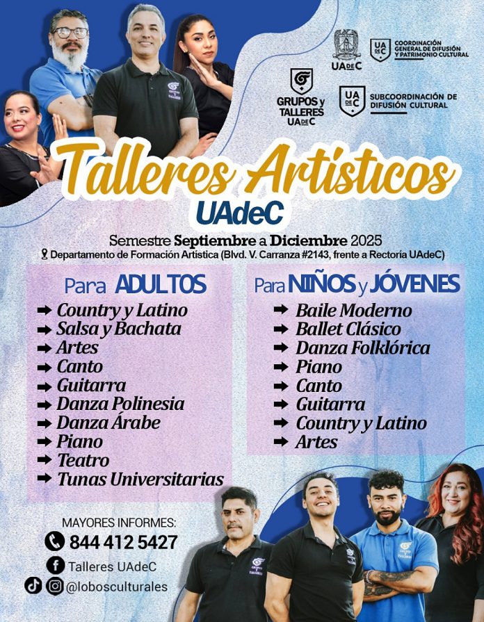 SALTILLO, Coahuila. 20 de agosto de 2025. La Universidad Autónoma de Coahuila, a través de la Coordinación General de Difusión y Patrimonio Cultural y el Departamento de Formación Artística, invita a la comunidad universitaria y al público en general a inscribirse a los Talleres Artísticos, cuyas clases iniciarán el próximo 1 de septiembre con una amplia variedad de disciplinas para todas las edades.