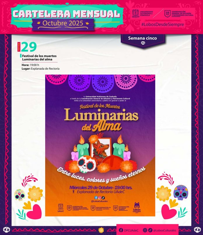 La Universidad Autónoma de Coahuila a través de la Coordinación General de Difusión y Patrimonio Cultural (DPC), invita a la comunidad universitaria de las Unidades Sureste, Norte y Laguna, y al público en general a disfrutar de las múltiples actividades culturales programadas durante el mes de octubre.