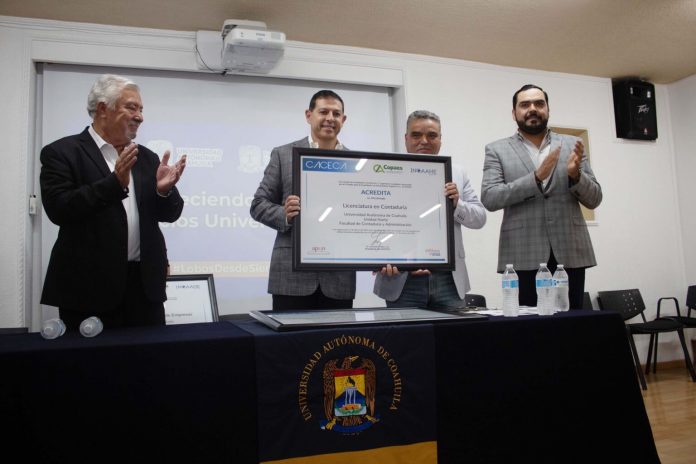 Monclova, Coahuila.- El rector de la Universidad Autónoma de Coahuila, Octavio Pimentel Martínez, encabezó la entrega de Acreditaciones del Consejo de Acreditación en Ciencias Administrativas, Contables y Afines (CACECA) a los programas de Licenciatura en Contaduría, Licenciatura en Recursos Humanos y Licenciatura en Administración de Empresas de la Facultad de Contaduría y Administración (FCA) de Monclova, además de la donación de mobiliario y equipo para el fortalecimiento de su infraestructura académica.