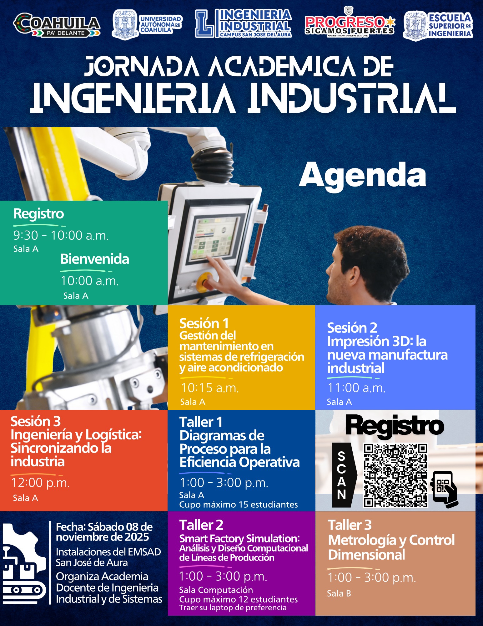 Las actividades se desarrollarán en EMSAD de San José del Aura, Progreso, Coahuila, los interesados deberán de registrarse en el siguiente enlace https://forms.office.com/r/YfpD1eQqPp; los temas que se abordarán son: Gestión del mantenimiento en sistemas de refrigeración y aire acondicionado; Impresión 3D: la nueva manufactura industrial e Ingeniería y Logística: Sincronizando la industria.